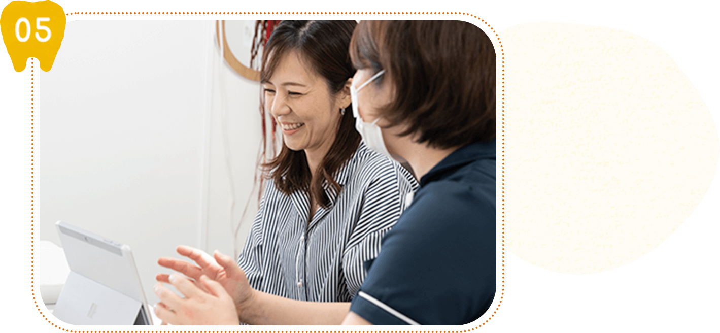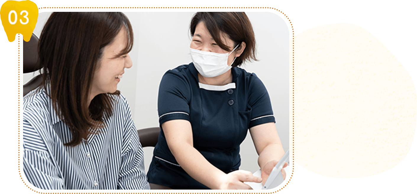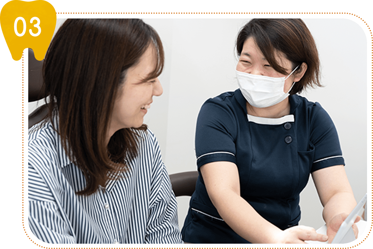 来院される患者様は、歯やお口に何らかの悩みを持たれている方がほとんどです。当院では、まずその辛いお悩みと向き合い正確に症状を把握することから始めます。そのため、治療前にはしっかりカウンセリングを行っております。